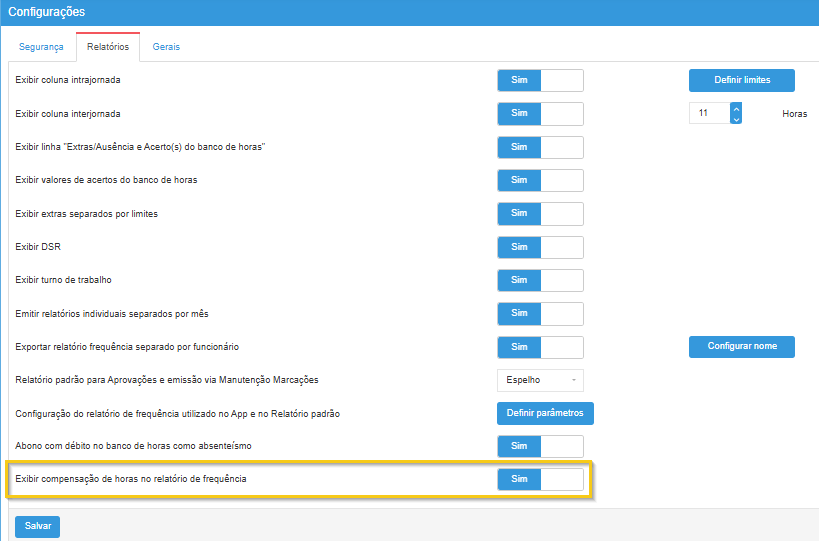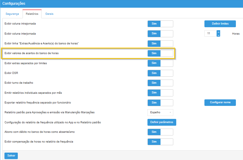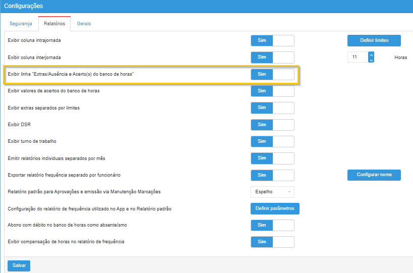 Esta funcionalidade permite ativar ou desativar a exibição da linha “Extras\Ausências e Acerto(s) do Banco de Horas” no relatório de frequência.
