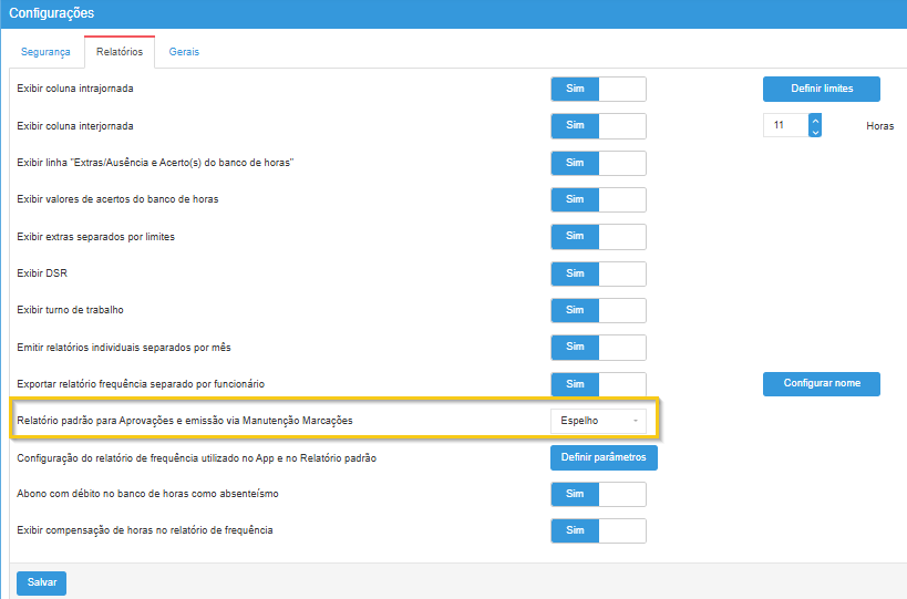 As modificações no tipo de relatório, seja Espelho ou Frequência, assim como nos parâmetros específicos do relatório de frequência, terão efeito apenas para as próximas aprovações enviadas.