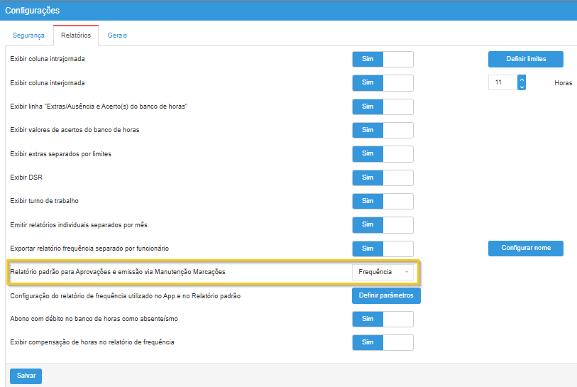 Configuração do relatório de frequência utilizado no App e no Relatório padrão