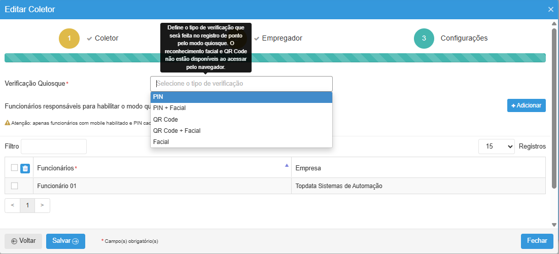 No passo “1 Coletor”, são configurados os dados do Quiosque: