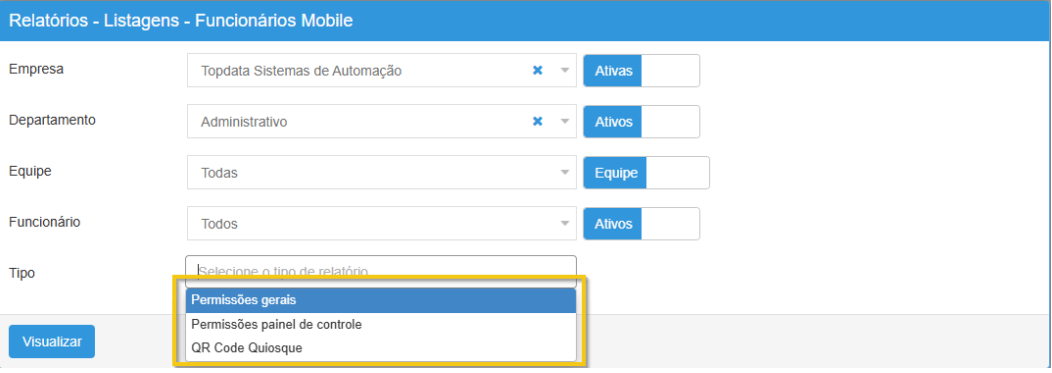 Exibe as permissões do funcionário definidas no seu cadastro na aba mobile.