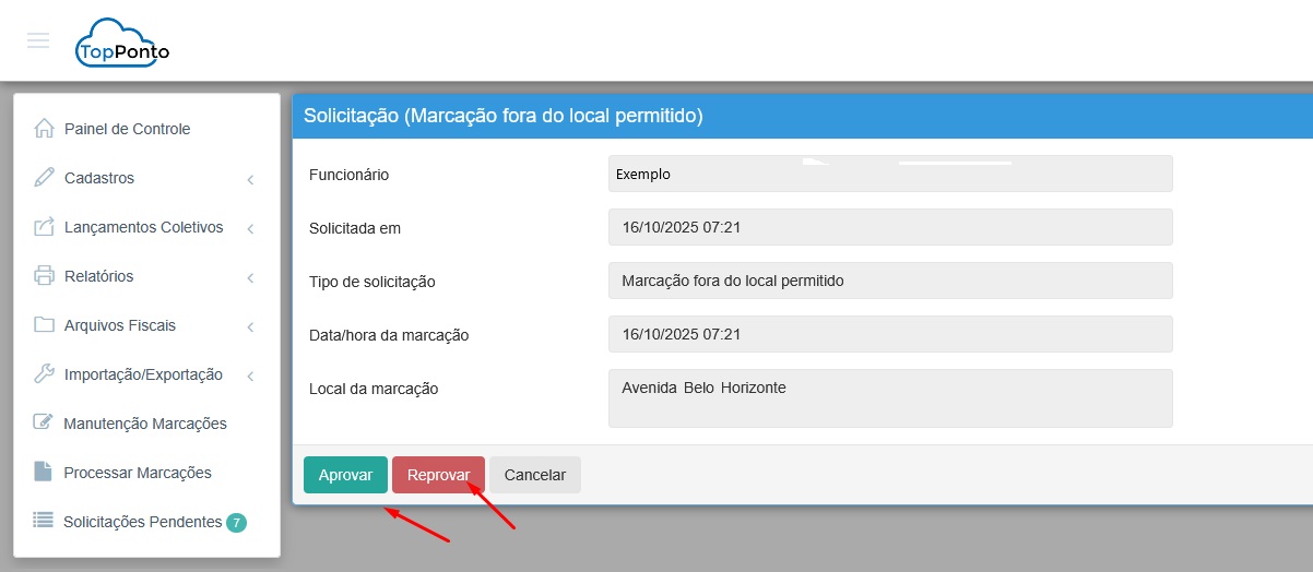A aprovação deve ser realizada no cadastro do funcionário, aba “Solicitações”.