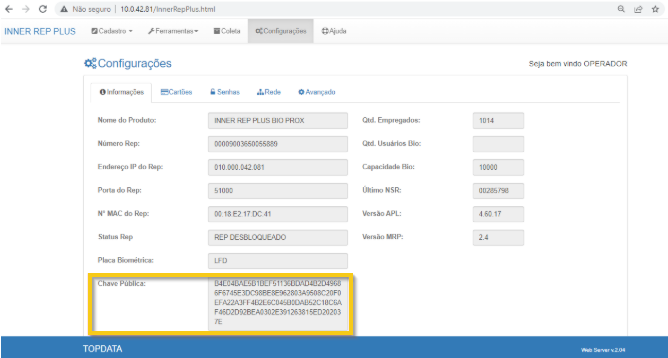 Importante: Para que a comunicação com o TopPonto funcione corretamente, o campo de empregador no REP deve estar: