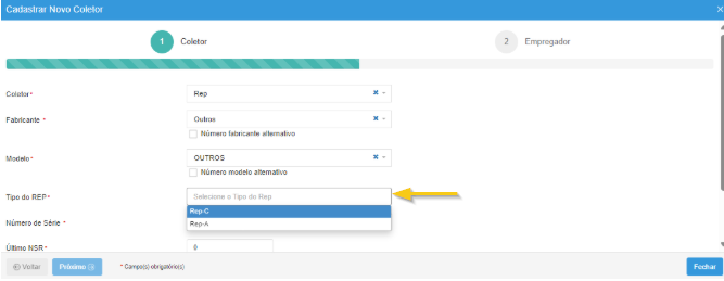 Quando o campo Fabricante estiver configurado como “Outros“, será necessário especificar o “Tipo de REP” utilizado, podendo ser REP-C ou REP-A conforme a seguir: