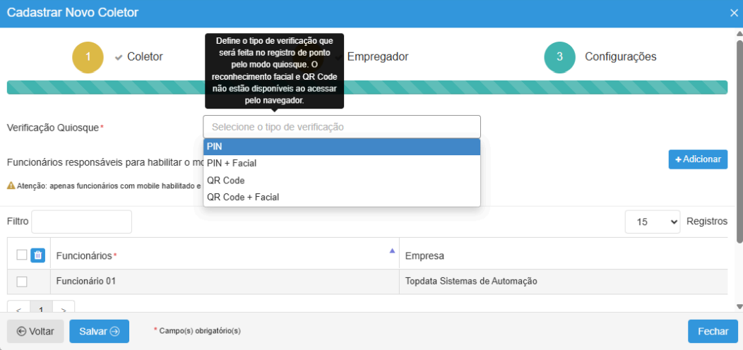 Funcionários que utilizam o Modo Quiosque apenas para realizar o registro de ponto necessitam somente do PIN ou QR Code. As configurações Mobile não são obrigatórias nessa situação, exceto se o empregador desejar conceder acesso ao funcionário para consultar as últimas marcações por meio do aplicativo.