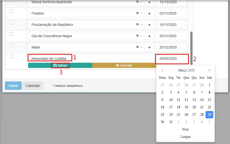 Para criar um novo dia, devemos clicar no ícone “+“, inserir o nome do dia, data e clicar em “salvar”. Vamos cadastrar como exemplo o feriado regional do aniversário de Curitiba, no dia 29/03: