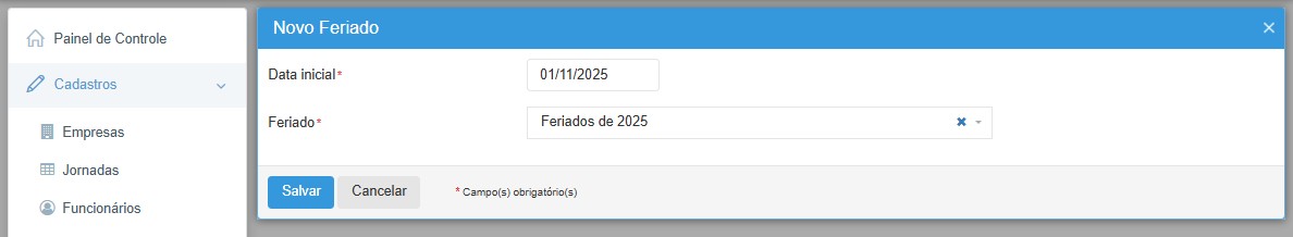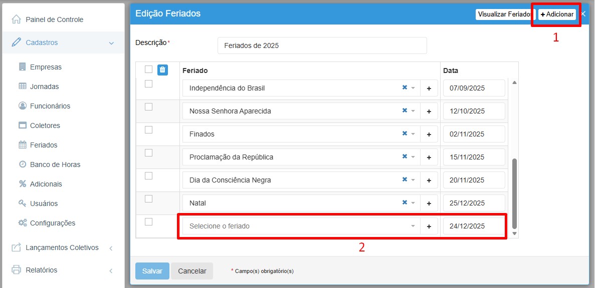 Supondo que tenhamos a necessidade de cadastrar um feriado regional, do qual não tem no calendário. Após selecionar o calendário que deseja em Cadastros > Feriados, devemos clicar em Adicionar, no qual abrirá um campo para adicionar o dia:
