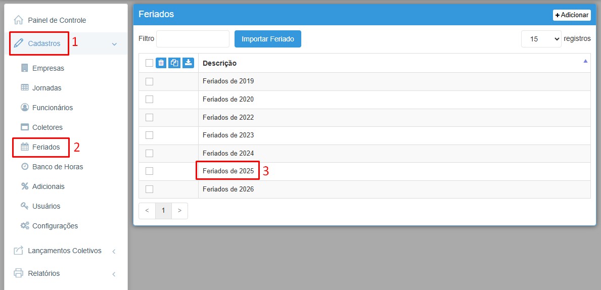Quando surge a necessidade de cadastrar um dia de feriado, devemos considerar que primeiramente devemos cadastrar este dia em um “calendário de feriados”, no caminho Cadastros > Feriados, podemos observar todos os “calendários” já criados. Vamos selecionar o calendário “Feriados 2025” como exemplo para adicionar um dia: