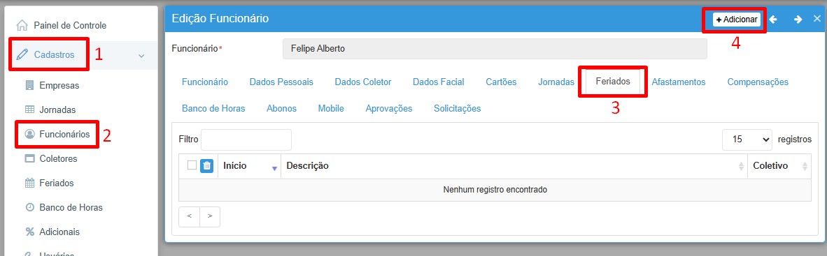 Quando se é necessário lançar o feriado para somente um funcionário, devemos ir até o perfil do funcionário em Cadastros > Funcionários > Feriados > Adicionar: