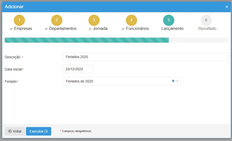 Devemos nos atentar à data de início, pois somente os feriados a partir da data de início entrarão em vigor. Este procedimento lançará todos os feriados que estão no calendário selecionado, para todos os funcionários selecionados no passo 4 do lançamento coletivo.