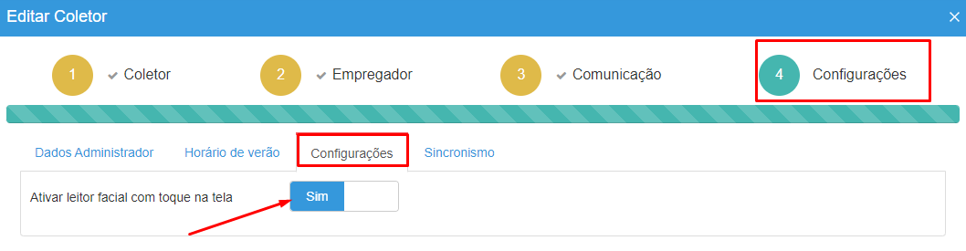 Em Cadastros > coletores selecionar o equipamento que deseja, e ir na aba Configurações guia configurações, na opção Ativar leitor facial com toque na tela, deve deixar como “sim”, dessa forma o facial só irá desbloquear com o toque na tela.