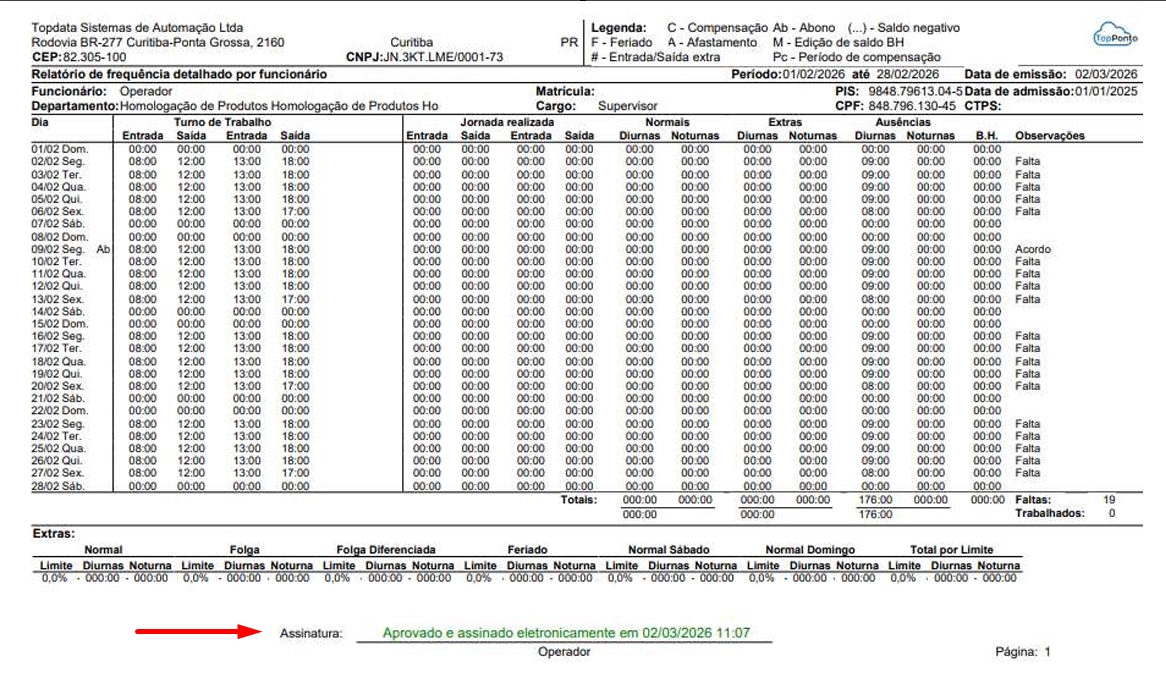 Quando aprovação é aceita pelo funcionário a assinatura fica na cor verde e informando que foi assinado digitalmente e constando a data e hora que a mesma ocorreu. Abaixo um exemplo: