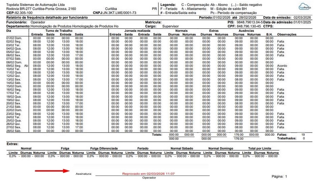 Quando aprovação não é aceita pelo funcionário a assinatura fica na cor vermelha e informando que reprovada e consta a data e hora que a mesma ocorreu. Abaixo um exemplo: