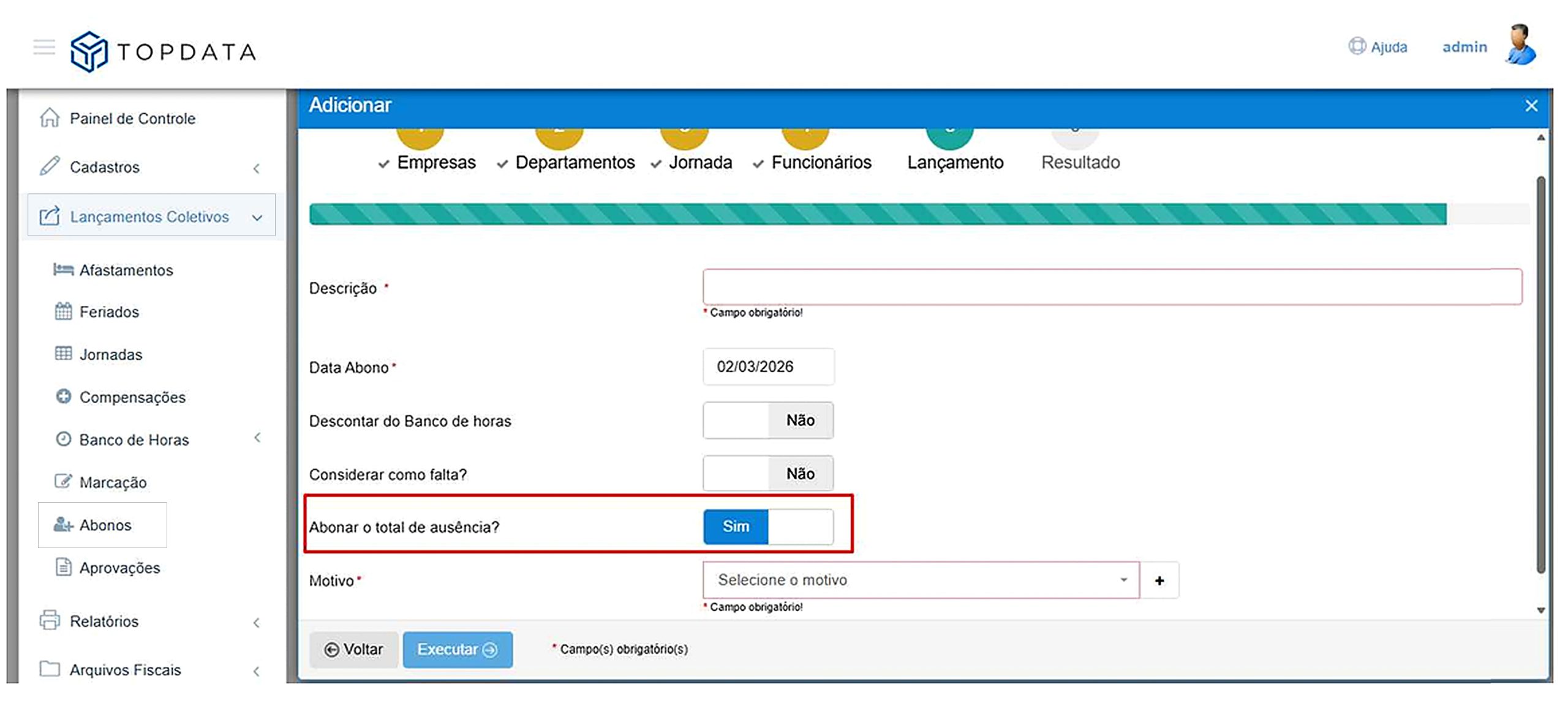 Basta que na aba de lançamentos seja marcada a opção “Abonar o total de Ausência?” como “Sim”. Desta forma o software vai abonar o total de ausências independente da carga horária: