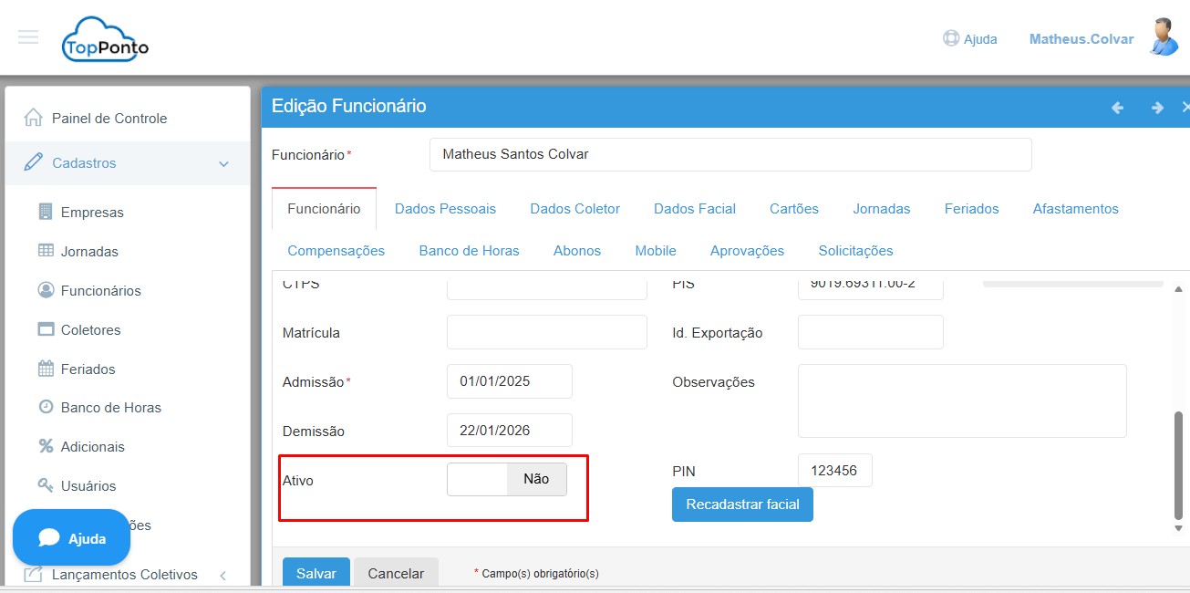 Após o procedimento de desligamento do funcionário e estipulado data da demissão , automaticamente o botão de ativo – Sim é acionado para ativo – Não conforme o print abaixo: