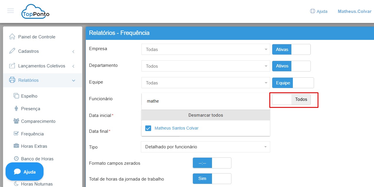 Para gerar o relatório como exemplo – Relatório de frequência, efetuar o filtro com funcionário para todos para listar conforme o funcionário solicitado: