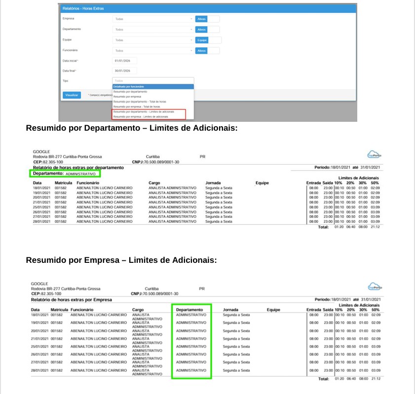 Esses relatórios apresentam somente os funcionários que realizaram horas extras no período informado e exibem apenas os adicionais que possuem horas nos limites.