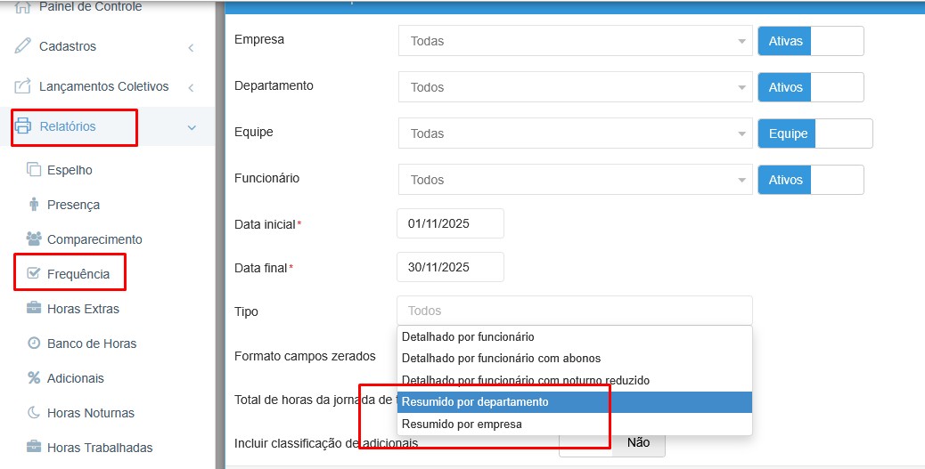 É possível fazer a consulta no Relatório de Frequência, utilizando os filtros por Tipo: “Resumido por departamento” e “Resumido por empresa”.