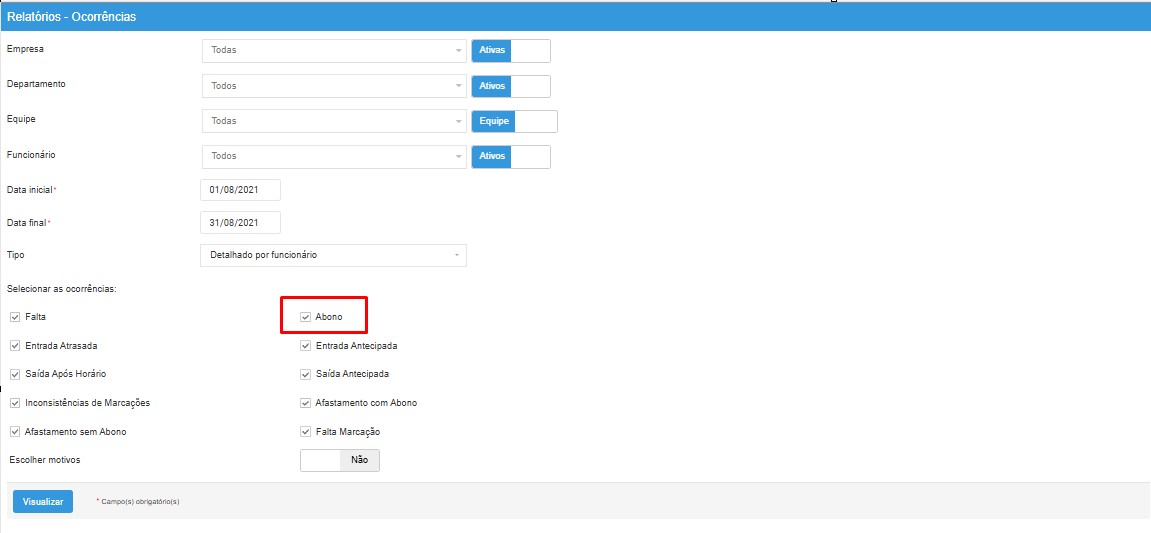 Em qual relatório do TopPonto Web é possível verificar a quantidade de horas abonadas em um período? É possível consultar a quantidade de horas abonadas no menu Relatórios > Ocorrências Esse artigo foi útil? Sim Não Artigos relacionados Em qual relatório do TopPonto Web é possível verificar o status das Aprovações? Como visualizar a escala do funcionário durante um mês no TopPonto Web? Em qual relatório do TopPonto Web é possível consultar o endereço em que uma marcação via mobile foi registrada? Em qual relatório do TopPonto Web é possível consultar o e-mail do funcionário? Nos relatórios que trazem informações sobre banco de horas, como diferenciar horas negativas das positivas Como verificar qual funcionário teve marcações pré-assinaladas geradas no Topponto Web?