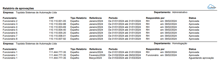 Nesta listagem é possível verificar todas as aprovações cadastradas para os funcionários, independente se a aprovação foi efetuado via RH ou via Funcionário.