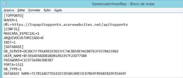 Quando instalado o Gerenciador Inner Rep de forma padrão, o arquivo fica localizado em C:\ProgramFiles (x86)\Topdata\Gerenciador Inner Rep\Bin\Topdata. Dentro do arquivo GerenciadorInnerRep.ini deve ser incluído os campos: