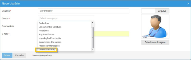 Cadastrar o usuário que será responsável de realizar a transferência de bilhetes do REP para a Web. Em “Cadastros”, “Usuários”, “Grupo” existe uma permissão específica para essa finalidade, o “Grupo” “Gerenciador Rep”. Observação: Um único usuário pode ser usado para vários REPs.