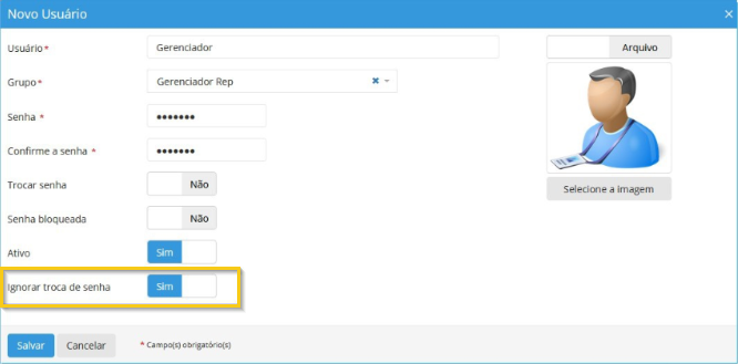 Preencher os campos com o nome do “Usuário”, “Grupo”, “Senha”, “Confirmar Senha” e “Salvar”.