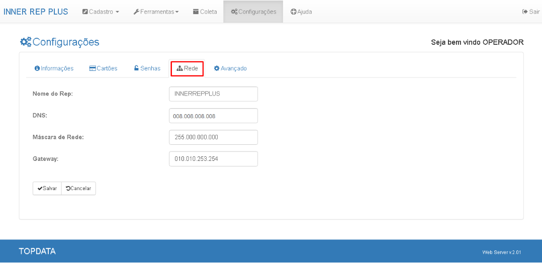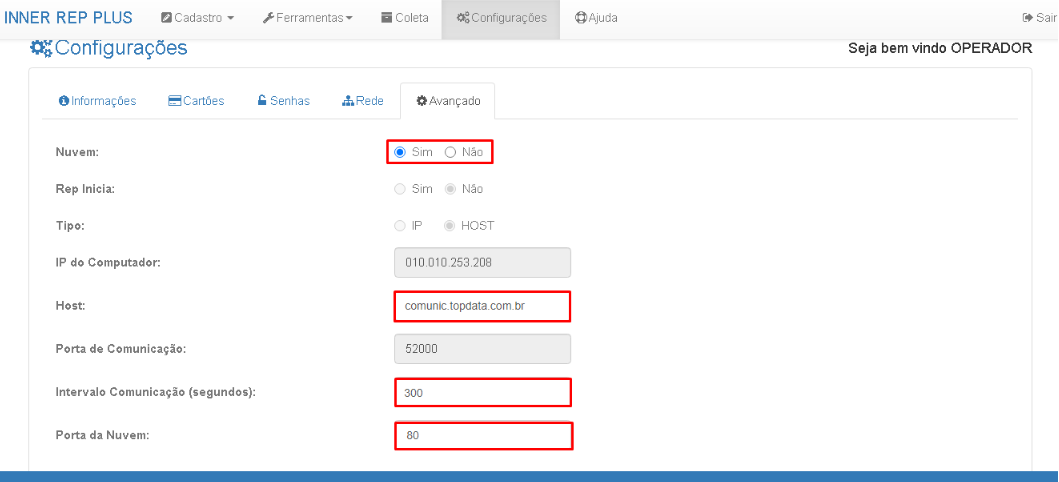 - O IP configurado no Inner REP Plus deve ter liberação de acesso à internet para conexão com o recurso de nuvem “comunic.topdata.com.br”.