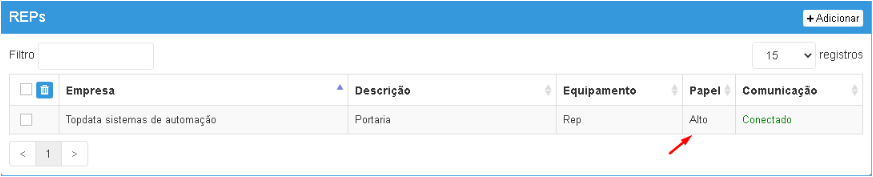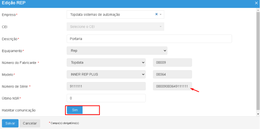 Incluir o cadastro do Inner Rep Plus em Cadastros→ REPs clicar em “Adicionar”, preencher os dados cadastrais do Inner REP Plus e no flag “Habilitar comunicação” marcar a opção “Sim”, conforme exemplo a seguir: