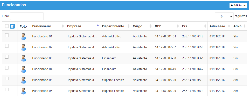 A empresa possui 6 funcionários distribuídos entre os setores Administrativo, Financeiro e Suporte Técnico.