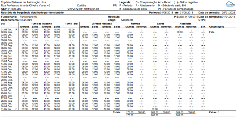 No período 01/05/2018 – 31/05/2018 os funcionários Funcionário 03 (Financeiro) e Funcionário 05 (Suporte Técnico) acumularam 09:00 horas de ausência cada um.