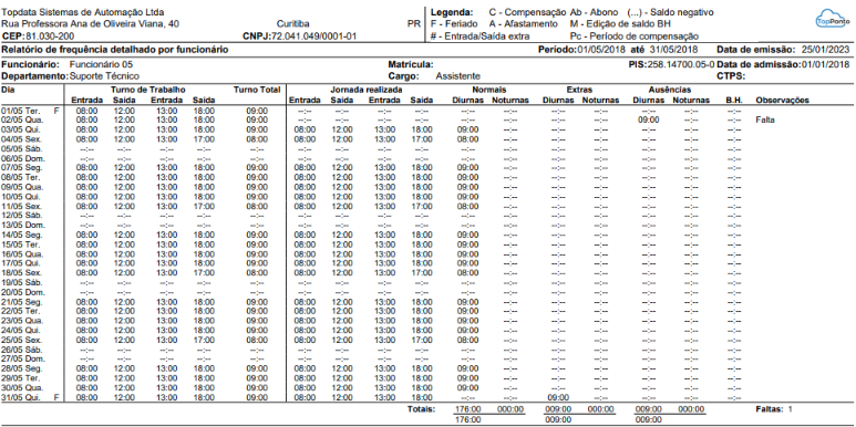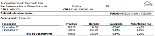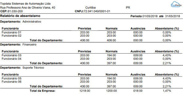 No período 01/05/2018 – 31/05/2018 os funcionários Funcionário 03 (Financeiro) e Funcionário 05 (Suporte Técnico) acumularam 09:00 horas de ausência cada um.
