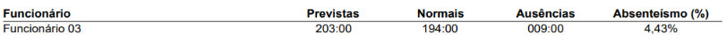Funcionário 03, Deveria ter trabalhado 203:00 horas no mês. Trabalhou 194:00.
