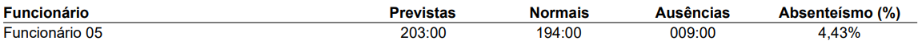 O Funcionário 04 não teve ausências no período, já o Funcionário 03 teve 09:00, então o total de ausências do setor foi de 09:00.
