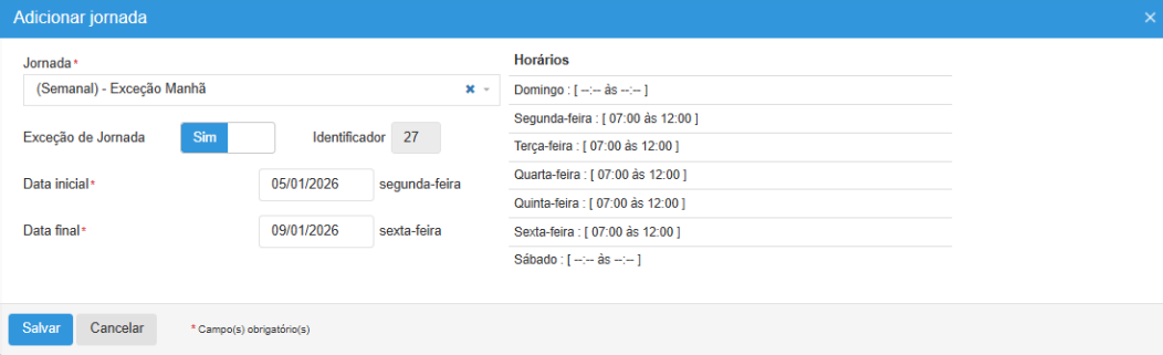 Observação: No tipo Dia completo e Dia parcial, o campos que estarão habilitados são os mesmos do momento da aprovação.