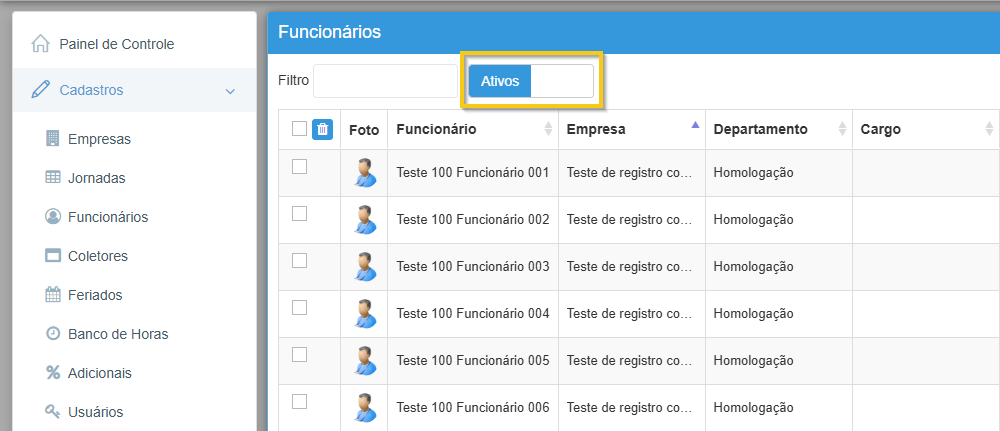 Para casos de readmissão, recomenda-se realizar um novo cadastro do funcionário, em vez de apenas remover a data de demissão. Essa prática ajuda a manter o histórico de desligamento, jornadas e marcações preservado.Para consultar informações do período anterior à demissão, basta, alterar o filtro de “Ativos” para “Todos”. Dessa forma, o sistema também exibirá os registros de colaboradores que já foram desligados.