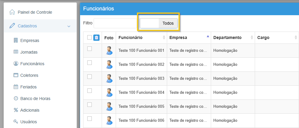 No campo Filtro, é possível buscar funcionários específicos, utilizando um dos critérios: