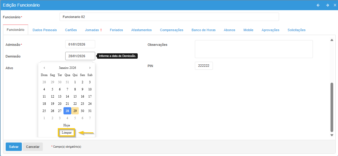 Caso o funcionário tenha sido demitido de forma incorreta, é possível utilizar a opção “Limpar” na data de demissão para reativá-lo no sistema, mantendo o mesmo cadastro ativo.