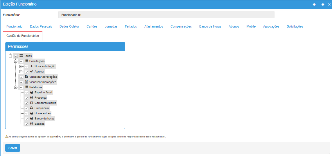 Nesta opção são definidas as permissões para os funcionários que são responsáveis de equipes, na qual é possível gerenciar seus funcionários através do aplicativo ou navegador.