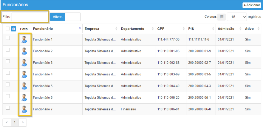 Observação: As fotos inseridas nos cadastros de funcionários podem ser visualizadas também pela lista de funcionários sem a necessidade de entrar no cadastro, conforme exemplo a seguir: