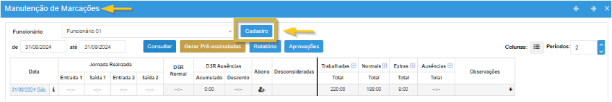 O acesso ao cadastro de um funcionário também está disponível através da funcionalidade “Manutenção de Marcações“ .