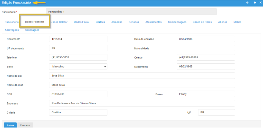 Nesta aba, são inseridas as informações pessoais do funcionário, abrangendo documentos de identificação, dados de nascimento, contatos e endereço.