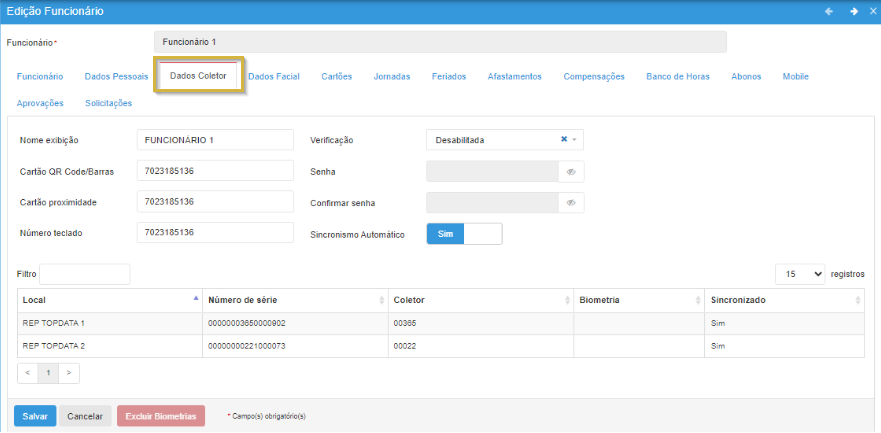 Essa aba garante o correto registro de ponto, associando cada funcionário ao seu método de identificação no coletor.