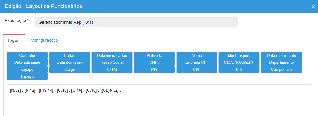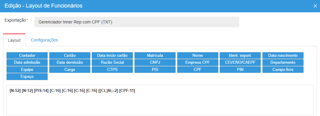 - Cartão: Número do cartão do funcionário, até 16 dígitos. Caso haja mais de um cartão cadastrado, sempre é exportado o número atual. Campo obrigatório.