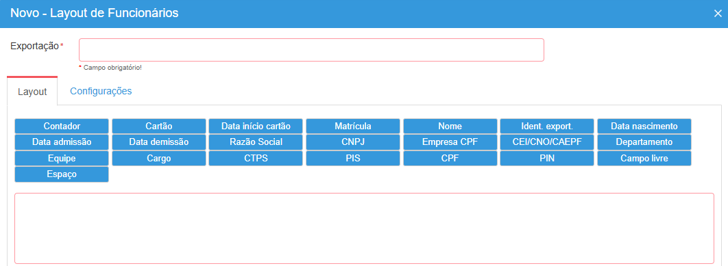 Para gerar o arquivo que será lido pela folha de pagamento, é necessário definir o layout do arquivo texto e selecionar os campos que deverão ser incluídos.