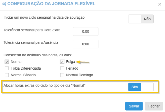 É possível definir quais tipos de dias (além dos “Normais”) devem ser incluídos no cálculo da jornada flexível semanal. Dias não selecionados são tratados com o cálculo diário e utiliza como tolerância a diária que é configurada em parâmetros.