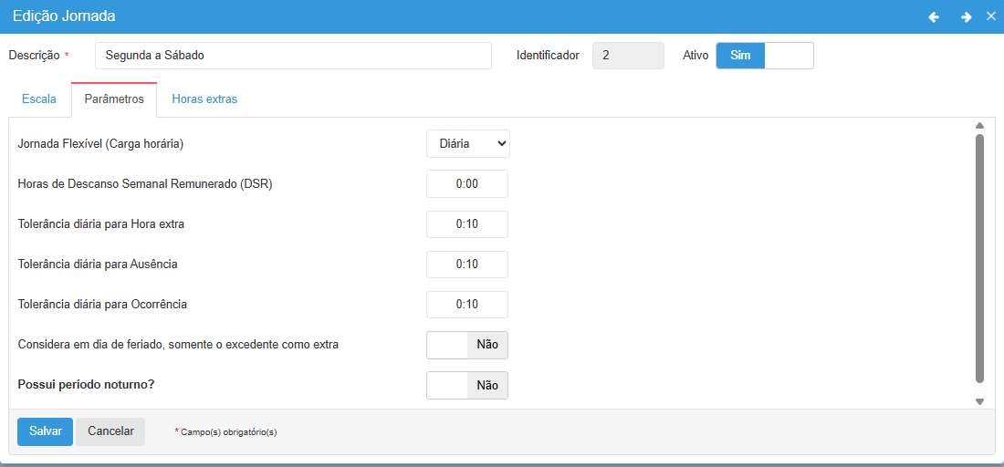 Na jornada do tipo Livre, a aba de configuração de “Horas Extras” é desabilitada automaticamente pelo sistema.