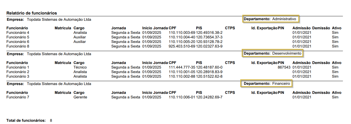 No tipo Detalhado por departamento, a listagem é apresentada com informações organizadas por cada departamento, facilitando a consulta e o gerenciamento de funcionários vinculados a setores específicos.