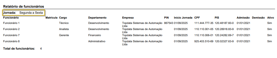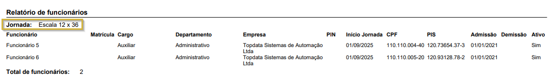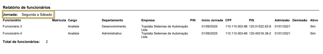 Ao selecionar o tipo Detalhado por jornada, a listagem de funcionários será organizada por jornada, com cada jornada exibida em páginas separadas.