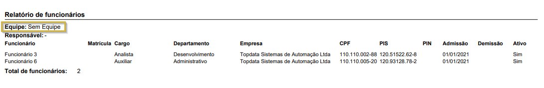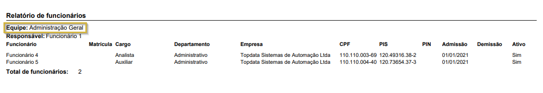 Ao selecionar o tipo Detalhado por equipe, a listagem de funcionários será organizada por equipe, com cada equipe exibida em páginas separadas.
